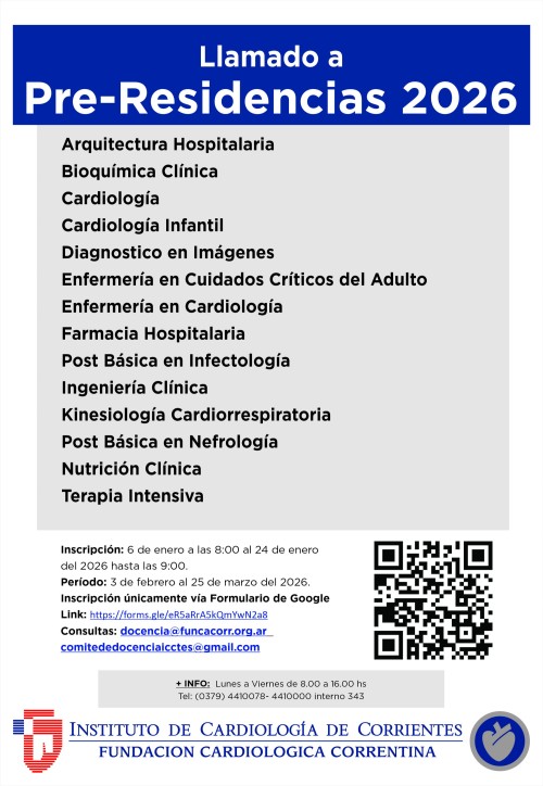 Arquitectura Hospitalaria · Bioquímica Clínica · Cardiología · Cardiología Infantil · Diagnóstico en Imágenes · Enfermería en Cuidados Críticos del Adulto · Enfermería en Cardiología · Farmacia Hospitalaria · Post Básica en Infectología · Ingeniería Clínica · Kinesiología Cardiorrespiratoria · Post Básica en Nefrología · Nutrición Clínica · Terapia Intensiva.