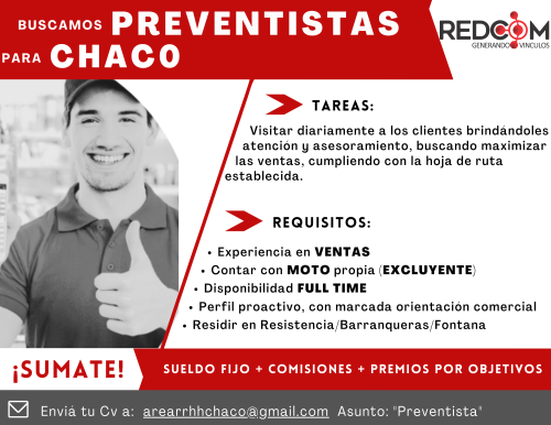 Buscamos PREVENTISTAS para incorporar a nuestro equipo de ventas, quienes visitaran diariamente a los clientes buscando maximizar las ventas, cumpliendo con la hoja de ruta asignada para lo cual es EXCLUYENTE contar con MOTO.