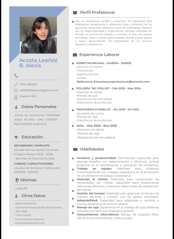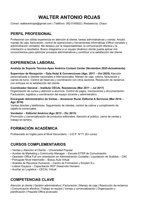 Profesional joven, versátil y adaptable, con experiencia en atención al cliente, gestión de operaciones y soporte técnico. Destaco por mi responsabilidad, organización y proactividad, manteniendo altos estándares de calidad y orientado a resultados. Manejo de caja, facturación y herramientas digitales. Busco aportar energía y compromiso en entornos dinámicos, contribuyendo al crecimiento y a mi desarrollo profesional.