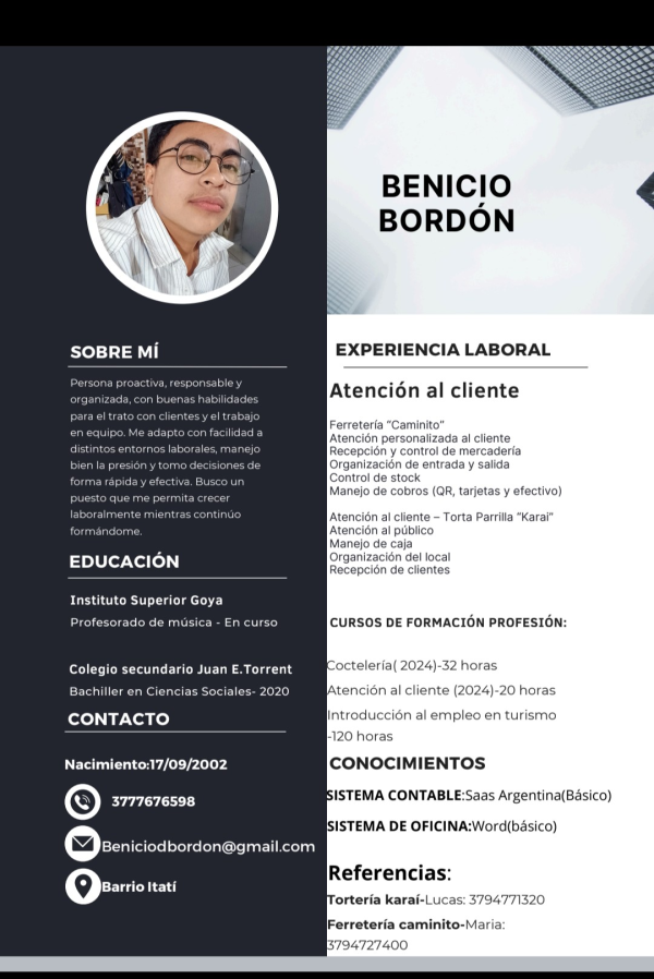 ¿Qué puedo aportar a tu equipo? Cuento con experiencia comprobable en atención al público, y ventas en comercio local (PetShop). Manejo herramientas informáticas (Word, y Excel básico) y gestión de redes. Mi experiencia previa coordinando contenidos y tiempos de entrega en medios me ha dado una gran capacidad de organización y responsabilidad.