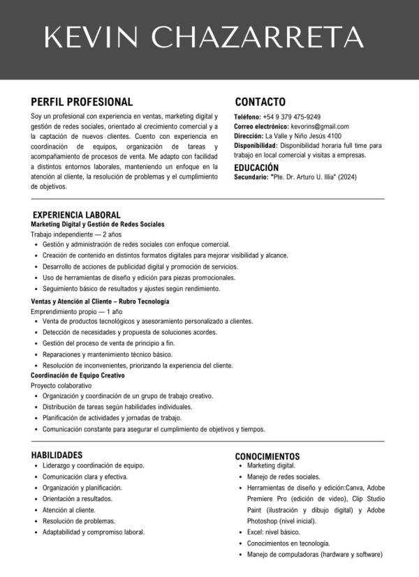 Mis puntos fuertes incluyen una actitud positiva, la capacidad de trabajar en equipo y una mentalidad creativa para resolver problemas. Me destaco por mi capacidad para escuchar y aprender de los demás, lo cual me permite ofrecer una atención personalizada y efectiva a los clientes. Además, poseo habilidades informáticas que me permiten manejar eficientemente las herramientas necesarias para la atención al cliente.