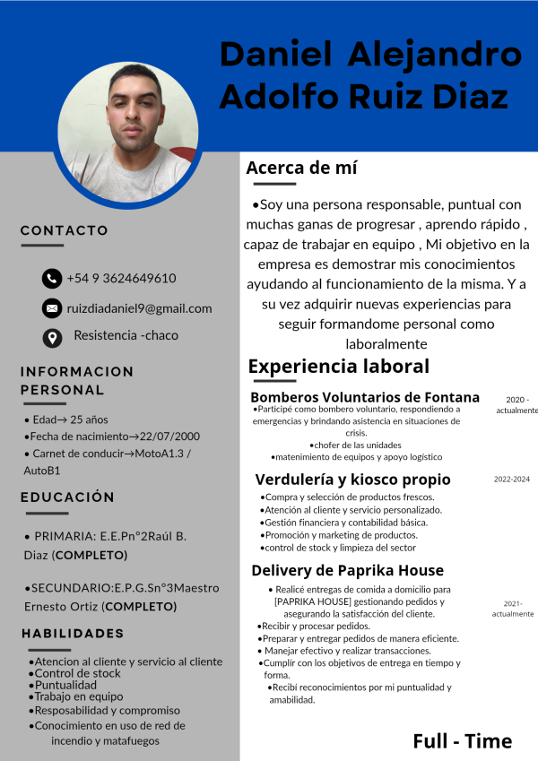 Hola, me llamo José, tengo 32 años soy de Fontana, tengo 3 años de experiencia en gastronomia e hice cursos de atencion al cliente.