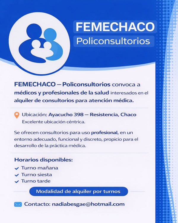 FEMECHACO – Policonsultorios convoca a médicos y profesionales de la salud interesados en el alquiler de consultorios para atención médica.
